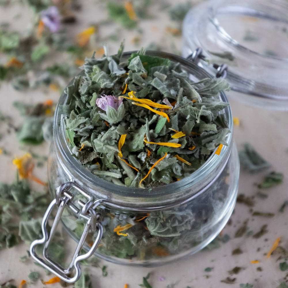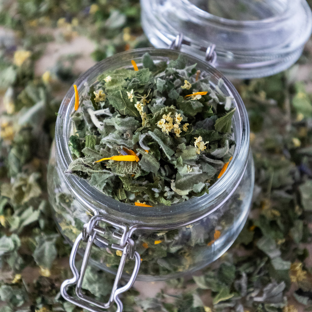 Ein Tee, wie ihn schon Großmutter gebrüht hat. Enthalten sind Kräuter und Blüten, welche schon vor hundert Jahren in unserem Garten gewachsen sind. Eibisch und Brennessel besitzen wohltuende Wirkungen. Der Geschmack wird durch Melisse und Lavendelblüten vervollständigt. Hollerblüten steuern ihren typischen süßlichen Geschmack bei. Damals ist noch zusätzlich Zucker oder Honig in den Tee gekommen, bei unserer Mischung ist kaloriensparend ein wenig Stevia für eine leichte Süße beigefügt.